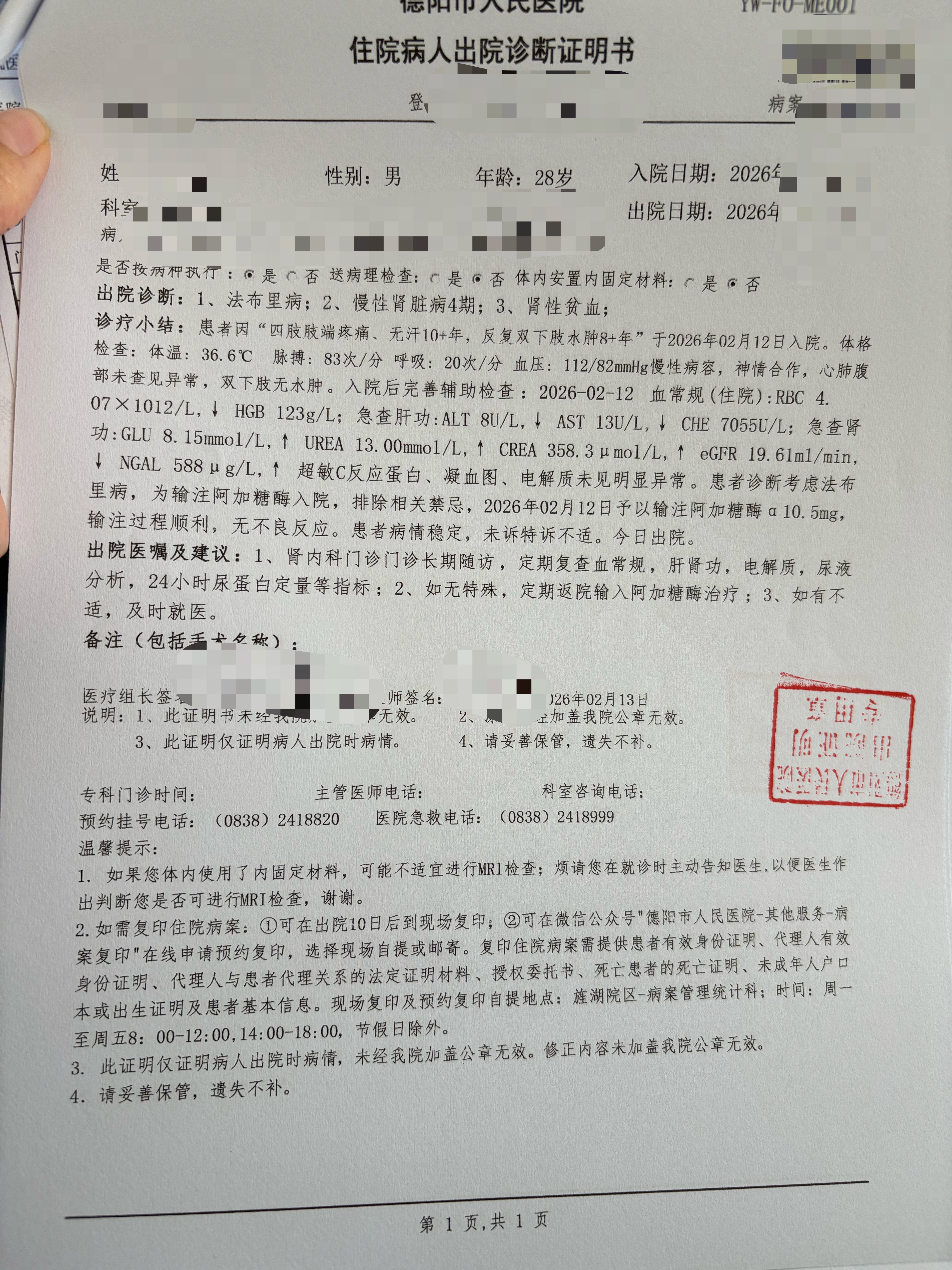 四川小伙阿飞的出院证明,他需要每两周到医院输药,缓解法布雷病带来的痛苦。(受访者供图)